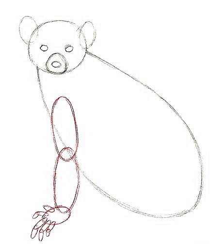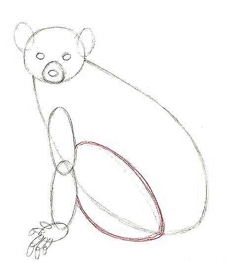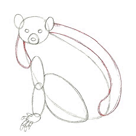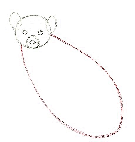 Starting from the right lower part of the body oval draw a long curved cylindrical shape reaching over the left upper part of the body oval. This will be the tail.