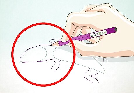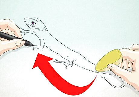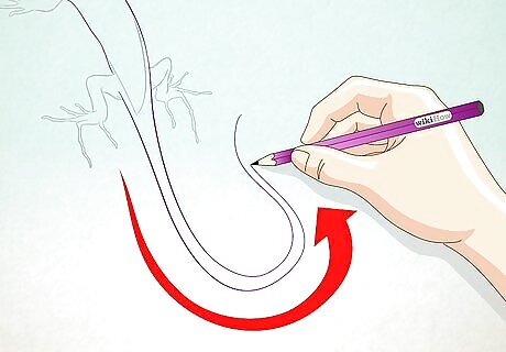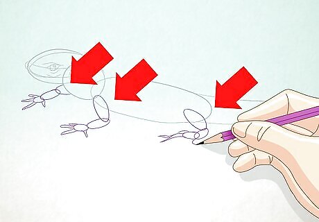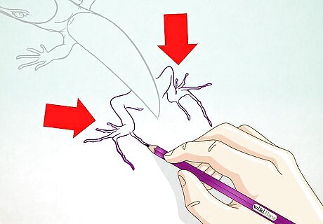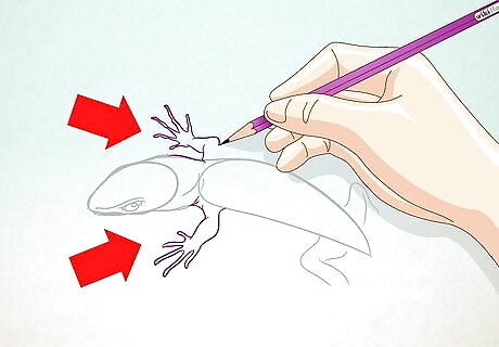 Add in the back legs. Draw the other leg and notice how the leg is pointing toward the other leg. The legs of a lizard are bow shaped.