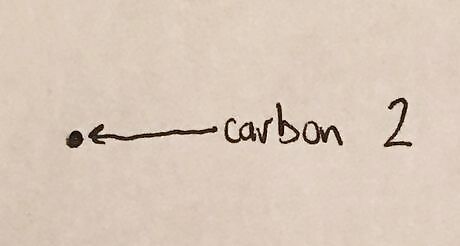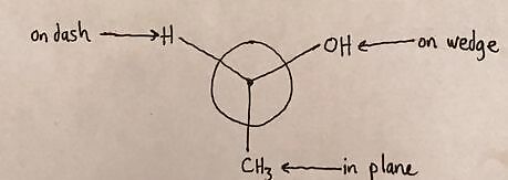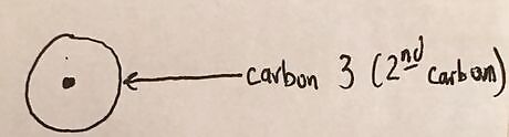 Draw atoms around the first carbon. Look at the 3-Dimensional Drawing from above and label which atoms are attached to this carbon and where each is located. Atoms on a wedge point right Atoms on a dash point left Atoms in the plane of the molecule go up or down.20170321_024406778_iOS (2).jpg