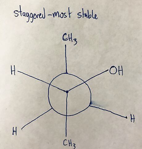 Rotate atoms around second carbon to create new conformation. Each 60 degree turn of the atoms creates a new conformation, and there are six total conformations for each Newman Projection. Staggered is most stable, eclipsed is least stable.20170325_032409022_iOS (2).jpg 20170325_032031093_iOS (2).jpg Completing the other three conformations is done in a similar way, with 60 degree rotations done for each.