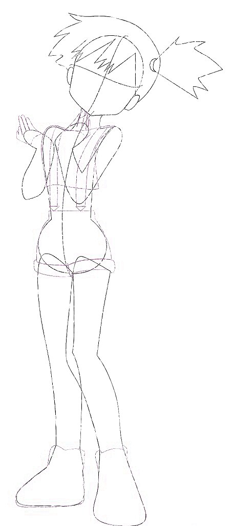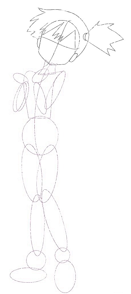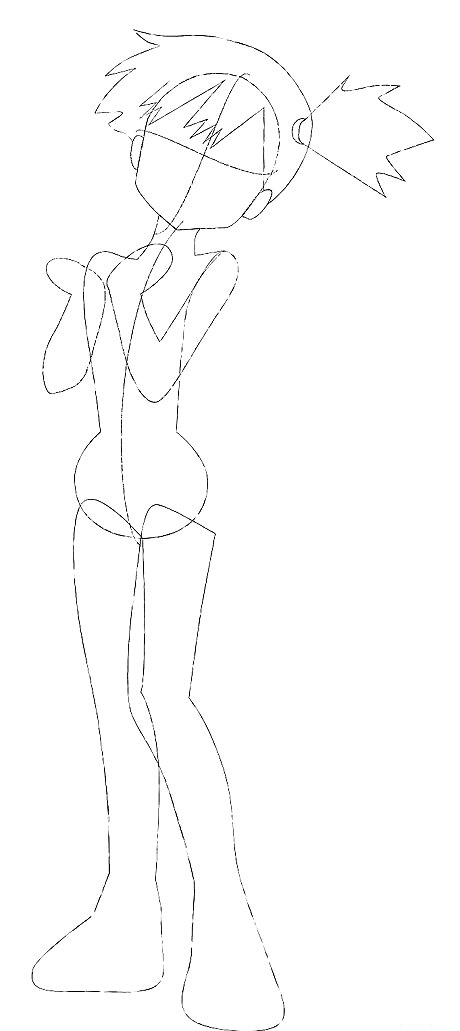 Now draw her body. Sketch first her neck then a trapezoid shape for the upper part of her body followed by a circle. For her arms and legs, draw a succession of ovals and circles copying the movement of her body. In this picture Misty is holding a Pokémon, so keep this in mind while drawing her arms and hands.