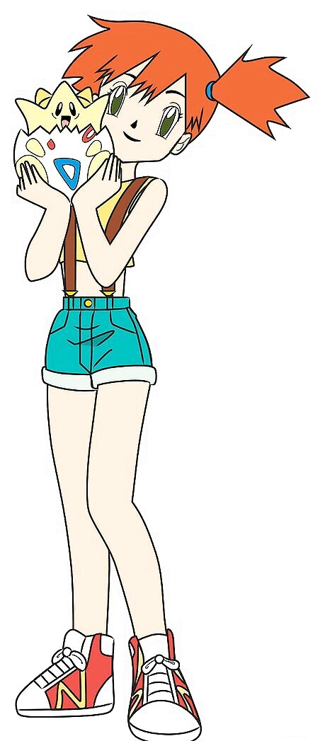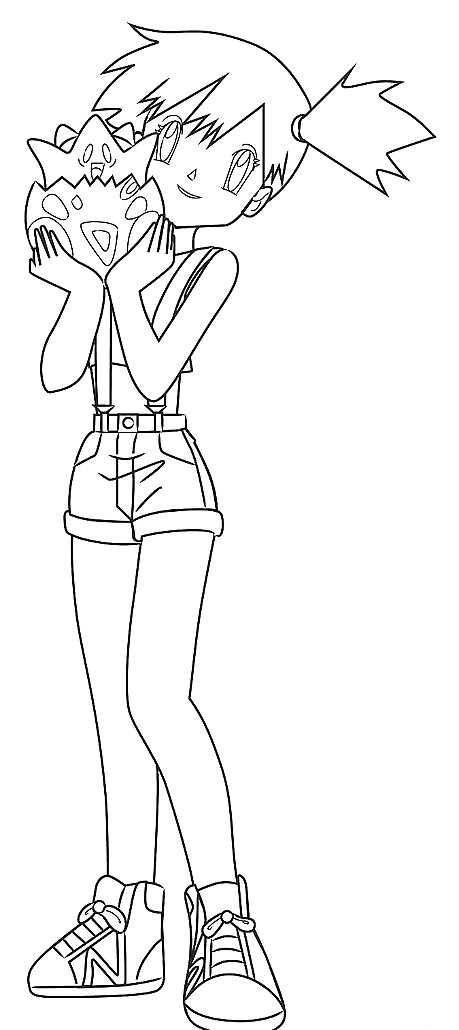 Draw the Pokémon Misty is holding. Sketch the bottom part of Togepi by copying the shape of a cracked egg and then by drawing its upper part resembling half a star shape.