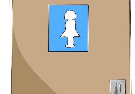 Locate the restroom and check your appearance. When you arrive, find the restroom and take a few minutes to refresh your look. This is a good time to take a few deep breaths and to make sure you look calm and collected. Run your hands under cool water in the restroom. This will help cool you off by lowering your body temperature slightly. It will also leave your hands free of sweat. Blot away sweat with moist towelettes. Apply baby powder to blot moist areas of your skin on your face. Reapply your antiperspirant. Be careful not to get any antiperspirant on your clothes. Touch up your makeup and hair. Clean up any smudged makeup and reapply lipstick to look fresh. Smooth any flyaway hair.