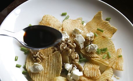Create “upscale” nachos with chips, blue cheese, and a balsamic glaze. Layer the bottom of a baking sheet with potato chips (ridged or not, it's your choice) and then sprinkle 4 ounces (110 g) of blue cheese and some diced green onion and walnuts overtop of the chips. Bake them at 400 °F (204 °C) for 5-10 minutes, and then drizzle them with 2 to 3 tablespoons (30 to 44 mL) of balsamic glaze. Try adding some fresh rosemary or thyme for an extra-aromatic experience.