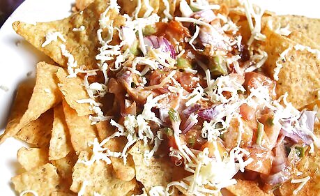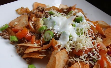 Make classic nachos with tortilla chips for a fun, shareable dish. Nachos are great because you can modify them with your favorite ingredients. Line a baking sheet with tortilla chips and then pile on some toppings: ground beef, olives, nacho cheese, jalapeño peppers, tomatoes, and sour cream. Or try grilled shrimp, mango salsa, and cotija cheese for a fun variation! Bake the nachos at 325 °F (163 °C) until the cheese is melted. Have a nacho bar at your next party: provide different toppings, keep the oven on, and let your guests create and bake their own personalized nachos.