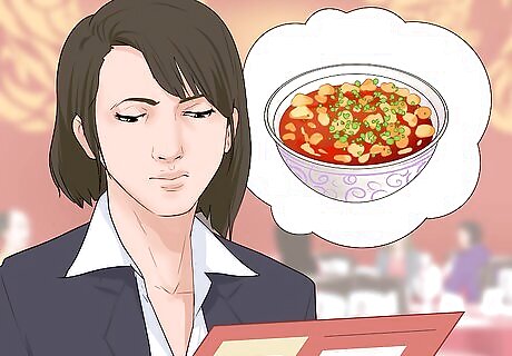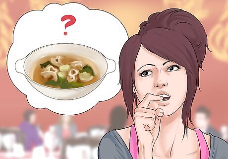 Choose a broth-based soup such as won-ton or egg-drop to start your meal. Soups are a great choice for helping to fill up without a ton of calories and can be full of extra protein and vegetables without adding calories. Avoid starters like Chinese noodles or fried wontons. While they may stave off hunger pangs while you wait to be served, it is an easy way to add hundreds of extra calories and unnecessary carbohydrates to your meal.