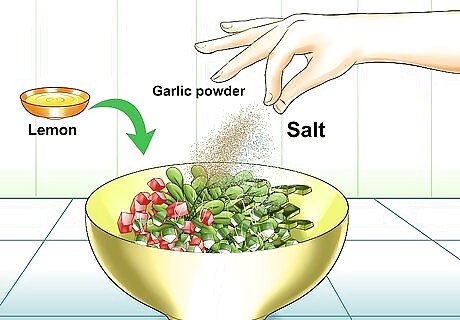 Season your salad to taste. Sprinkle salt on your salad a little by little. Toss the salad and taste it to check its flavor after adding salt each time. To add a little more bite to your salad, similarly add garlic powder or crushed black pepper. Increase tartness by adding more lemon juice. The jalapeno in the salad will be toned down by the flavor of the lemon. For a spicier salad, add a small amount of crushed red pepper and mix it in with the other ingredients.