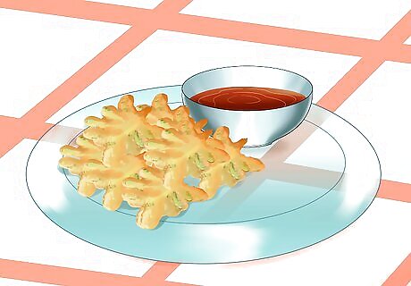 Eat fried purslane plain or with dipping sauces. Remove the purslane from the pan and lay it on paper towel to absorb excess oil. When it has cooled, it’s ready to eat. Lightly salt and pepper the purslane to taste. Try fried purslane with dipping sauces, like catsup, mustard, and sour cream. Experiment with different toppings to discover your favorite way of eating it. For example, you might try a light drizzling of teriyaki or soy sauce on the fried purslane.