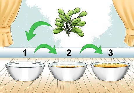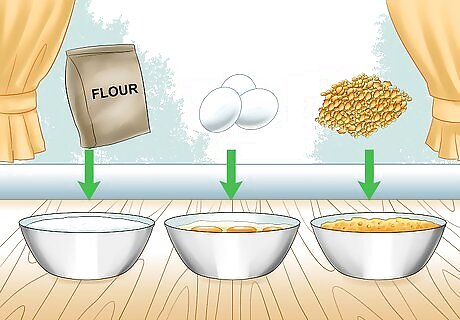 Prepare the flour, eggs, and breadcrumbs. Fill three medium size mixing bowls or shallow dishes each with a moderate amount of flour, eggs, and breadcrumbs. Bowls should only have one ingredient apiece. Whisk or beat the eggs with a fork until they are well blended. Make the breading process easier by lining up the bowls so the first one contains flour, the second beaten eggs, and the third bread crumbs. If you end up running out of an ingredient while making fried purslane, you can always add more. Leftover ingredients should be used immediately in another dish or thrown away.