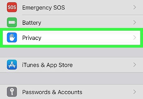 Scroll down and tap Privacy. The ‘Privacy’ button can be found in the third section of options within Settings. It is located at the bottom of this section directly below ‘Battery’.