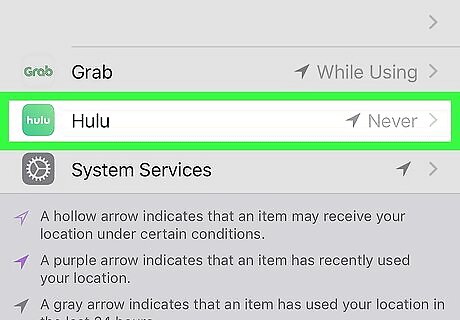 Scroll down and tap 'Hulu'. The apps are in alphabetical order, so where Hulu falls on your device may vary depending on the apps you have installed. If you don't see this option, then you won't be able to adjust your locations settings for Hulu on your phone.