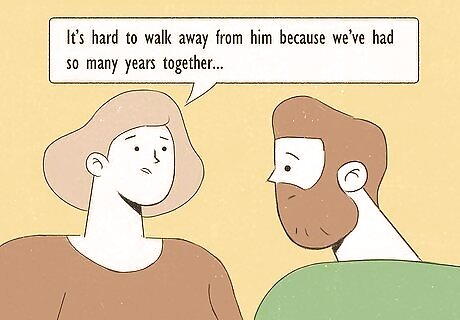 Talk to a close friend about your feelings and listen to their advice. Your friend likely has a different perspective on your relationship than you do because they’re looking at it from the outside. Tell your friend how you feel about the breakup and what you want for the future. Then, listen to any advice they may have to offer. You might say, “It’s hard to walk away from her because we’ve had so many years together. I’m worried she’s the only one for me. Sometimes I think we should just get back together.”
