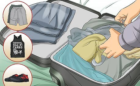 Pack the appropriate exercise clothes. Bring along comfortable shoes, a pair of leggings or loose shorts, a T-shirt, and whatever undergarments you’ll need. If you’ll be swimming, grab a suit and some goggles. Even if you don’t think you’ll have time to work out, bring along the supplies you need in case you find yourself with an extra half an hour.