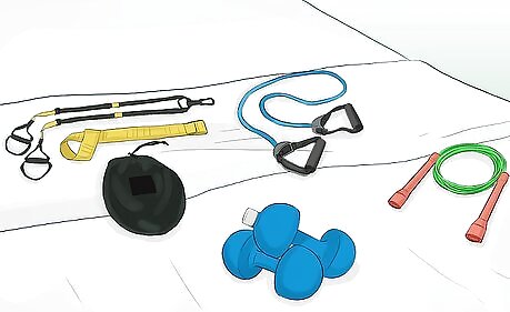 Use travel-friendly workout equipment in your room. Bring along equipment that’s lightweight and easy to use in your hotel room, such as resistance bands, a jump rope, suspension systems such as TRX, or weights that can be filled with water. Some equipment used for stretching, such as foam rollers and massage balls, also come in smaller travel sizes. Make your own weights by filling a couple of water bottles with water or sand once you get to your hotel.
