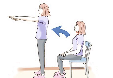 Try sit-to-stand exercises if you have reduced mobility in your legs. Sit at the front edge of a sturdy chair with your back straight and your feet flat on the floor. If you are able, stand upright using only your legs. Otherwise, place your hands on your knees to help boost yourself up, or use an anchored grab bar or a sturdy table to help pull yourself up. Slowly sit back down and repeat. Unless otherwise directed by your doctor or physical therapist, aim to build up to 3 sets of 10-12 repetitions. This exercise can help to build leg strength and improve your balance. Don’t try this or any other new exercise without talking to your doctor first, however.