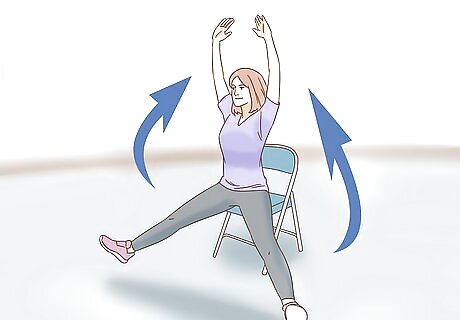 Give seated jumping jacks or air boxing a try as aerobic exercise. For seated jumping jacks, sit upright in your chair or wheelchair, with your hands lowered to your sides. Keep your arms straight and raise them up over your head so that your open palms clap together, then lower them back down to your side and repeat. Take 1 second to raise your arms and 2 seconds to lower them, and aim for 3 sets of 20 reps. For air boxing, simply practice doing various punching moves with both arms while seated. Aim for 3 sets of 30 seconds apiece.