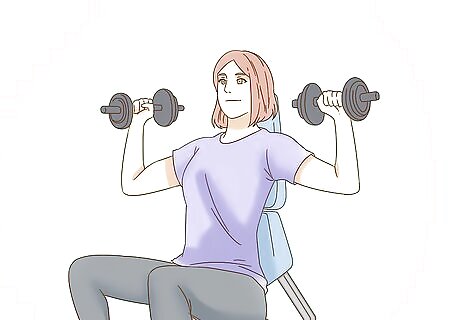 Build upper body strength with seated shoulder presses. Sit upright in your wheelchair or another sturdy chair. Hold a hand weight in each hand, positioned to the side of each ear and with your closed palms facing forward. Lift the weights straight up until your arms are fully extended, then bring them back down to the starting position. Alternatively, you can use elastic fitness bands instead of hand weights. Either sit on a long fitness band and hold each end in your hands, or tie 2 fitness bands securely to the arm rests of your wheelchair. For strength-building, use heavier weights (or bands with more resistance) and aim for 3 sets of 10-12 reps. However, don’t try to lift more weight than you can handle comfortably. For aerobic exercise, use lighter weights (or bands with less resistance) and aim for 3 sets of 20 reps. Take 1 second to raise the weights and 2 seconds to lower them with each rep.