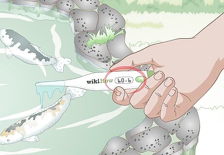Take the water temperature. The amount of food and frequency with which you feed your koi also depends on water temperature. A change in temperature impacts your koi’s eating habits. Higher temperatures quicken the koi’s metabolism, while lower temperatures slow it down. When water is between 60 to 85 °F (15.6 to 29.4 °C), feed your koi two to four times per day. When the temperature lowers to 50 to 60 °F (10 to 16 °C), feed them once a day or every other day. Monitor the temperature year round. If the temperature rises above 90 or below 50 °F (10 °C), it is best to stop feeding your koi as their metabolism will slow and they will not be able to properly digest their food. Koi will still have access to food in those cases where the water temperature is too high or too low. They will be able to eat the algae on the pond liner or rocks.