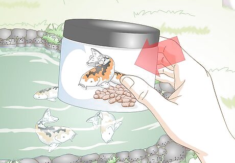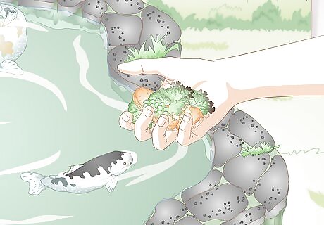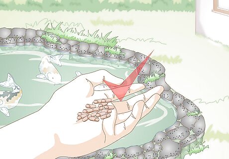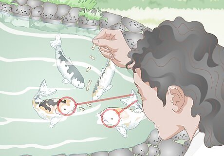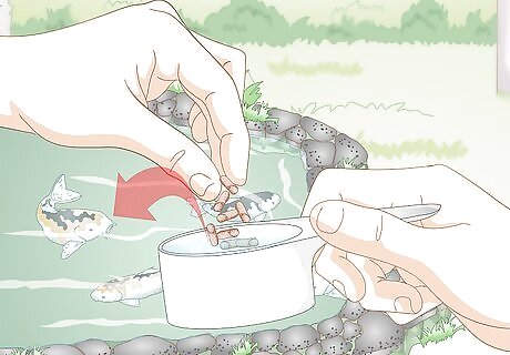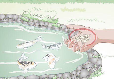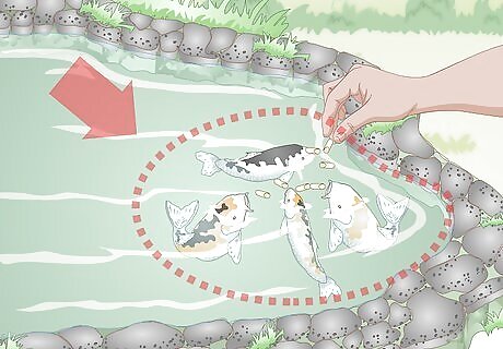 Choose a “feeding station.” Establish a “feeding station” that you use each time you feed your fish. Ideally, it should be located near the edge of the water where you can keep an eye on how much they are eating and can check them for disease.