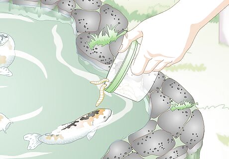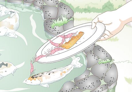 Feed koi live foods. Koi may enjoy eating live foods from time to time, like they do in the wild, as a special treat. This can also be a good way to supplement their base diet. Feed koi crustaceans, insect larvae, worms, and aquatic plants. Also include live plants to give koi some roughage and added vitamins and minerals.