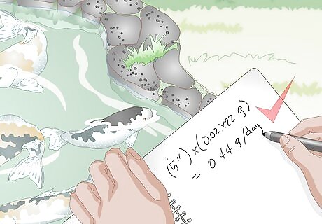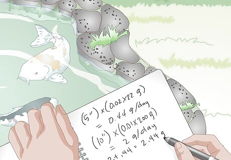 Calculate the amount of food for multiple fish. You’ll most likely have more than one fish in your pond, so you need to figure out the total amount of food you’ll need to feed all your fish each day. To get this number, add together the total grams needed for each fish. For example, say you have a one-year-old koi and a four-year-old koi in your pond. The one-year-old koi is five inches long and weighs 22 grams. The four-year-old koi is ten inches long and weighs 200 grams. The water temperature is 72 °F (22.2 °C). Based on age, weight, and water temperature, your one-year-old should receive two percent of their body weight as food per day and the four-year-old should receive one percent. Using the calculations from the previous step, the one-year-old needs 0.44 grams of food per day. The four-year-old needs 2 grams per day [(10 in.) x (0.01 x 200 grams) = 2 grams per day]. Add 0.44 and 2 together to get the total grams you need for both of your fish each day (2.44 grams).
