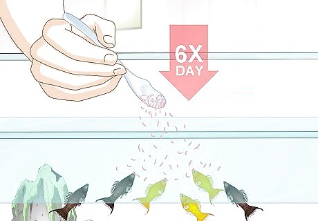 Feed young fish more frequently. Young fish, that is fish under three months old, should be fed more frequently, but in smaller meals. If your fish is less than a month old, you may need to feed it as many as six meals a day. You’ll have to watch them more carefully, but providing small portions for their stomachs to handle. Remember that this is a trial and error process. Make sure that only a small portion of the food makes it to the bottom of the tank. As a starting point, feed your fish with what it can eat in about 30 seconds.