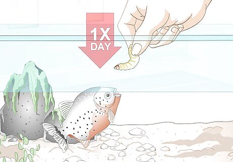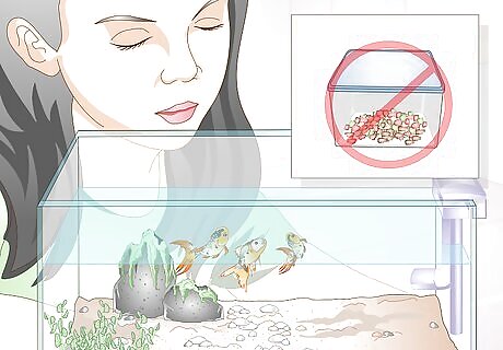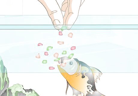 Ignore begging fish. Once your fish are familiar with their environment, they may swim near the surface to beg for food. Don’t give in, no matter how cute you think it looks. Keep their feedings to once or twice per day. Remember, a hungry fish is a healthy fish. If your fish really are underfed, they will look emaciated, and fight one another more often during feedings.