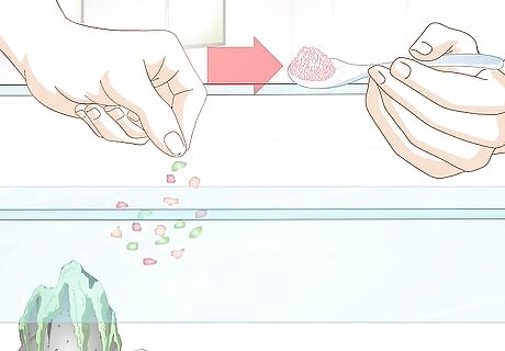 Feed your fish once a day. Because fish are cold-blooded, their metabolism is tied to the water temperature in the tank. With your tank’s temperature kept around 74-78 degrees, it will take about 16-24 hours for your fish to fully digest their food. One feeding per day is enough to make sure they get the proper portion, and have time to digest it properly. You can feed more than once a day. If you do that, though, it should be in smaller portions. Avoid overfeeding. This is the most common mistake people make. In addition to leaving extra food to clean up, eating too much will cause your fish to become bloated. If your fish have been overfed, they will float to the top and swim upside down. In addition, they will probably produce more waste, making it harder to clean the tank.