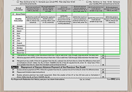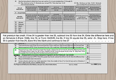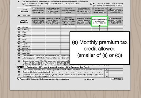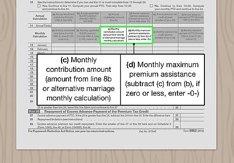 Determine the maximum premium assistance you were allowed. In Part II, column (c) of your Form 8962, enter the amounts you calculated for annual and monthly contribution amounts in Part 1 of the same form. Then subtract those amounts from the amounts you listed in column (b). Enter the results in column (d). If you subtract column (c) from column (b) and get a zero or a negative number, simply enter "-0-" all the way down the column.