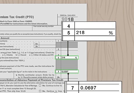 Use your percentage to find your "applicable figure" on the table in the instructions. Use Table 2 in the instructions to determine which number you'll need to write on line 7. Check line 5 on your Form 8962, then locate that number on the first column in Table 2. The value across from it is your "applicable figure." Enter that value on line 7 of your Form 8962. For example, if the number you entered on line 5 was "218," you would enter "0.0697" on line 7.