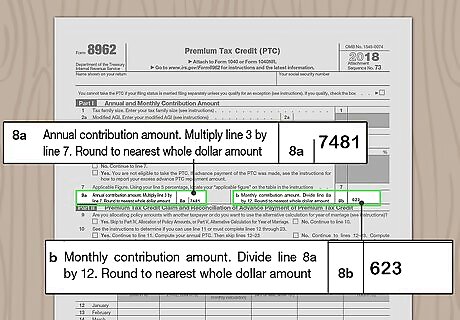 Multiply your household income by your applicable figure to find your contribution amount. Use the household income amount you provided on line 3. Round the result down to the nearest dollar amount. This is the annual amount you're expected to contribute towards your health insurance premiums. Enter this amount on line 8a. If you divide the amount on line 8a by 12, you'll get the monthly amount you're expected to contribute towards your health insurance premiums. Enter this amount on line 8b.