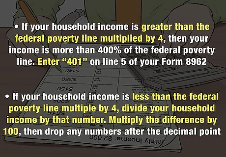 Calculate your household income as a percentage of the federal poverty line. Use the federal poverty lines provided in the instructions for Form 8962. Then multiply the federal poverty line you used by 4.0. Compare that number to the number you provided on line 3 for household income. If your household income is greater than the federal poverty line multiplied by 4, that means your income is more than 400% of the federal poverty line. Enter "401" on line 5 of your Form 8962. If your household income is less than the federal poverty line multiple by 4, divide your household income by that number. Don't round your answer. Multiply the difference by 100, then drop any numbers after the decimal point. For example, if the difference was 1.8545565, you would enter 185 on line 5 of Form 8962.Tip: There are 3 different federal poverty lines used: 1 for the 48 contiguous states and the District of Columbia, 1 for Hawaii, and 1 for Alaska. Make sure you use the one that applies to the state where you lived during that tax year.