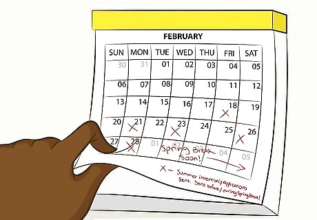 Turn in internship applications early. There are generally more students than there are internship opportunities, especially for paid ones, so start early and turn in your applications before the deadline to make sure you don’t miss it. Many large companies with lots of competition hold early deadlines in the fall, while other internship deadlines might not be until the spring, so do your research and know when the deadline is. Since many deadlines are in the spring, most people start looking for internships in the early fall. Give yourself several months to adequately search for and fill out applications.