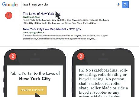 See if your locality has digitized its law books. Many local governments have their law books printed and easily available on the internet. Try doing an internet search using keywords like "laws in..." and then the specific area. If you're lucky, the document will be searchable, so you can quickly type in a few keywords and find the information you're looking for. If your local laws aren't available on the internet, they will still be available on paper. Try contacting your city or town hall and inquiring about looking up a certain law. Someone may be able to look it up for you, or you may have to go down yourself and look it up.