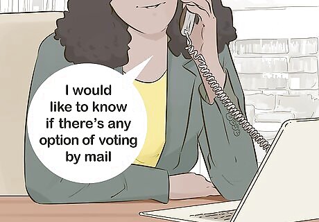 Check to see if your voting jurisdiction allows voting by mail. Many countries allow you to vote in elections by submitting a ballot through the mail. Contact your local election office to find out if they have the option of voting by mail. If they do, you can request a ballot, complete it, and mail it back in before the voting deadline. Be sure to fill out the ballot completely. Some jurisdictions may reject incomplete ballots.