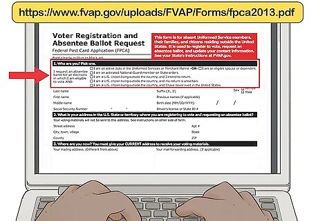 Request a ballot if you are a military member overseas. If you’re in the armed services and are stationed out of the country, you may still be able to vote. Many nations offer programs to help their men and women in uniform cast their votes. You must request and complete a voter registration form and absentee ballot request, which will get you an absentee ballot that you can use to vote in an election. If you’re a member of the US armed forces, request and complete a Federal Postcard Application (FPCA), which will register you to vote and apply for an absentee ballot you can use to vote. You can pick up a copy at an embassy, consulate, or go online for a digital copy.