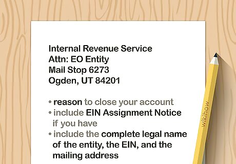 Draft a letter to close your business account with the IRS. Write a brief letter to the IRS stating that you want to close the business account associated with your EIN. Include the complete legal name of your business, your business's EIN, your business's address, and the reason you want to close the business account. There are a few reasons you might want to close a business account with the IRS. For example, if you requested an EIN for a business and then never ended up stating that business up, it would make sense to close the business account. If you operated a business under that EIN, you might be better off simply leaving the business account open. If you started another business later, you'd be free to use the same EIN as long as it had the same ownership and structure.