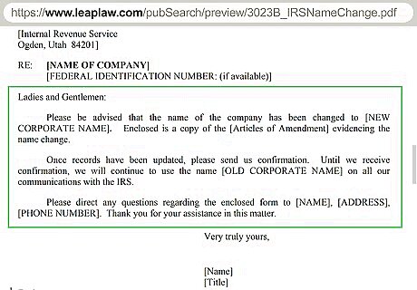 Send written notification of a business name change. If you change the name of your business, but the ownership and structure remain the same, you don't need a new EIN. However, you do need to notify the IRS in writing if the legal name of your business has changed. The way you notify the IRS depends on how your business is structured. If you have an LLC, go by how your business is taxed (as a corporation or as a partnership). If your business is a sole proprietorship, write to the address where you filed your return. Include your EIN, your business's previous name, and your business's new name. If your business is organized as a corporation, mark the appropriate name change box of your corporation's tax return and enter the new name. If you've already filed your tax return, you can send a written notification the same as a sole proprietor. If your business is organized as a partnership, you can mark the name change box on your tax return or send a written notification to the address where you last filed your taxes.Tip: Any request for a business name change must be signed by someone who is authorized to change the business's name, such as a sole proprietor, partner, or corporate officer.