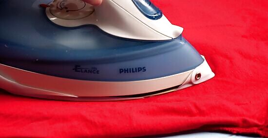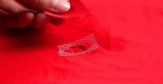 Flip the shirt inside out and place the materials over the hole. Place the bonding web between the hole and the patch of fabric. Line it up over the hole over the shirt so it can’t be seen through. The side of the fabric you want to show through on the outside of your shirt should be facing down.