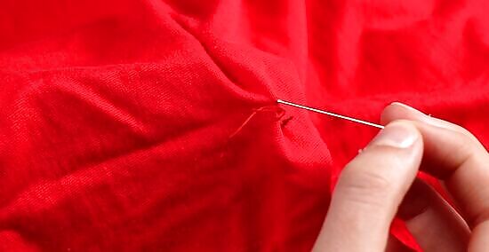 Flip the shirt inside out to start your stitch. Poke the needle through the fabric at the top and to the right of the hole from the inside out. Weave through the fabric about .2 inches (0.51 cm) above the hole. If you’re any closer to the hole, the thread may pull out, and your stitch could fall apart. Keep pulling the needle up through the fabric until the knot you made at the end of the thread catches on the fabric.