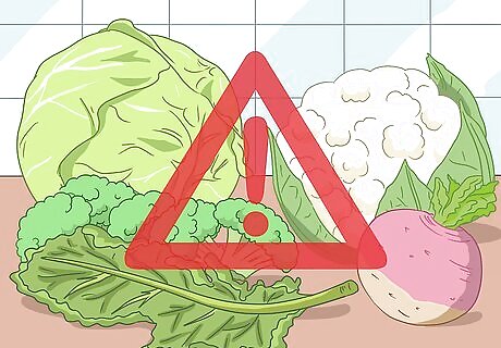 Limit goitrogenic vegetables. Goitrogens are molecules that can interfere with your thyroid function. Goitrogenic vegetables are cruciferous vegetables. The problem occurs when you eat large amounts of the raw vegetables. Try cooking these vegetables for around 30 minutes before eating. If you want to eat these foods, make sure to eat them in moderation. Goitrogen foods include: Asparagus Broccoli Spinach Brussel sprouts Cauliflower Cabbage Turnips Kale and mustard greens Radishes Soy