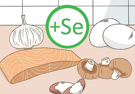 Include more foods with selenium. Selenium is important for proper thyroid function. Selenium helps your body convert T-4 to T-3, which your body may have trouble with if you have thyroid problems. Selenium can be found in the following foods: Brazil nuts Fish like cod, halibut, salmon, snapper, and tuna Eggs Shrimp Sunflower seeds Turkey Garlic Crimini mushrooms