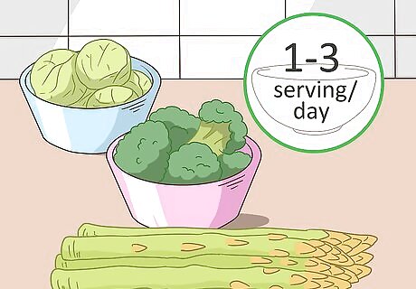 Eat goitrogenic vegetables. Goitrogens are molecules that can reduce the amount of thyroid hormone you produce. Goitrogenic vegetables are cruciferous vegetables. Try to eat one to three servings of these vegetables each day. Goitrogen foods include: Broccoli Cauliflower Cabbage Asparagus Spinach Brussel sprouts Turnips Kale and mustard greens Radishes