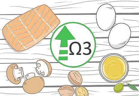 Increase omega-3 fatty acids and vitamin D. These two nutrients work together to help improve thyroid health. Increasing the amount of omega-3 fatty acids and vitamin D you eat can help your hyperthyroidism. Make sure to eat foods with these nutrients at least once daily. Salmon is a great source of omega-3 fatty acids and vitamin D. Vitamin D can be found in eggs and mushrooms. Omega-3 fatty acids can be gotten in your diet through walnuts, olive oil, and flaxseeds.
