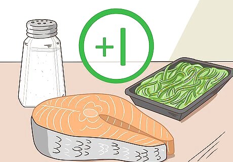 Increase your iodine intake. Iodine is an important nutrient for balancing thyroid hormones. Iodine can be found in iodized table salt, but you can also get it in food. Iodine is mainly found in seafood, such as salmon, tuna, and seaweed. Iodine is also found in dairy foods like cow’s milk, eggs, and yogurt. You can also get iodine from potatoes and navy beans.