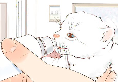 Bottlefeed young mother-less kittens. If the kittens are still bottle feeding, make sure you feed them every two to three hours. Before feeding, warm the formula to 99–101 °F (37–38 °C). Wrap the kitten in a towel to keep it secure and then feed it until it is full. The employees at the shelter or rescue should give your clear instructions about this process and how long to continue it. Do not feed the kittens cow milk. Instead, give them special kitten formula. You can buy this from a vet or pet store. Remember, very young kittens will even need feedings every 2 to 3 hours, even in the middle of the night. You can pre-mix enough formula for the kitten for 24 hours but you need to keep it refrigerated. Only heat as much formula as you will use for one feeding. When first bottle feeding a kitten, it may have a hard time latching on. Be patient, keep trying, and make sure that the nipple of the bottle has a big enough hole in it to release drops of milk. If all else fails, you can call the shelter or rescue for help.