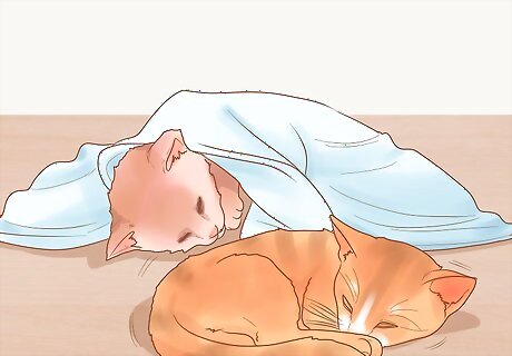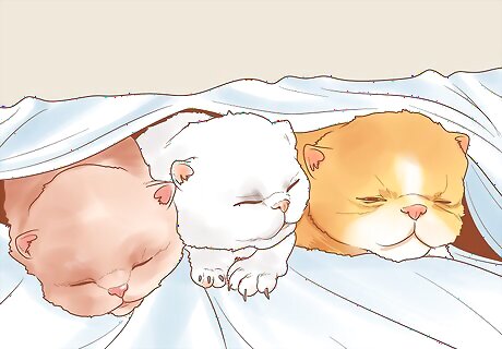Keep the kittens warm and clean if there is no mother cat. Kittens cannot regulate their own temperature well. Usually the mother cat will keep them warm and clean, but if there is no mother, it will be your job to make sure that the kittens are clean, dry, and warm. Make sure that there is no food or feces stuck to the kitten's fur. You can put a heating pad specifically made for pets to provide a warm spot in their nest. Only warm half of the nest, and put the heating pad under the blankets. This will let the kitten go to the cooler corner if they get too warm. Do not use a heating pad made for humans.