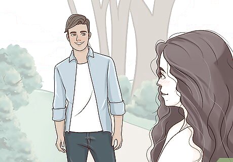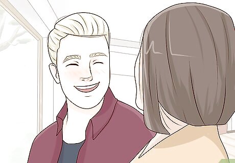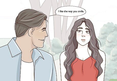 Smile at her to signal that you’re friendly and approachable. Smiling is your face’s way of advertising that you’re a likable person. The next time you cross paths with your crush, flash her a smile so warm she’ll have to open a window. If she shoots you one back, you’ll know you’re on the right track. In case you need more convincing, scientific studies suggest that people tend to be more attractive when they smile. A dazzling smile can be a great icebreaker, but try not to force it. It will be obvious to her and exhausting for you.
