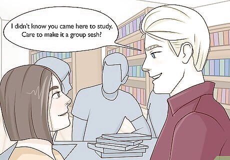Find excuses to hang around her. It doesn’t matter how attractive you are if you’re never actually in the same place as your crush (after all, she can’t notice you if you’re not there). Make your presence known, but be subtle about it. If she’s in one of your classes, choose a seat near her to put yourself in her line of sight. If you know where she works, pop in every now and then, or start frequenting the place next door. If one of your friends is also friends with her, you might also try angling to get yourself invited to the next group hang. Avoid being too obvious about the fact that you’re trying to get closer to her. She may find it flattering, but there’s a better chance that she’ll find it creepy. An offhand remark like, "I didn't know you came here to study. Care to make it a group sesh?" will likely be received much better than, "I was hoping I'd find you here. Do you want to hang out?"