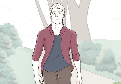 Project confidence through assertive body language. Stand up straight, hold your head high, and walk with purpose. When dealing with others, look them in the eye and speak in a loud, clear tone of voice. If you want the girl of your dreams to notice you, you have to be able to stand out in any room you’re in rather than simply disappearing in it. If you seem self-assured, she’ll be more likely to think that you’ve got something going for you, which can make her stop and take note. There’s a big difference between “confident” and “cocky.” While a proud demeanor says that you know your worth, an arrogant one says that you only care about yourself, which is a major turn-off.Tip: Confidence has universal appeal, so learn to embody it even if you’re not feeling it. Research indicates that there may be some truth to that old saying, “Fake it ‘til you make it” where confidence is concerned.
